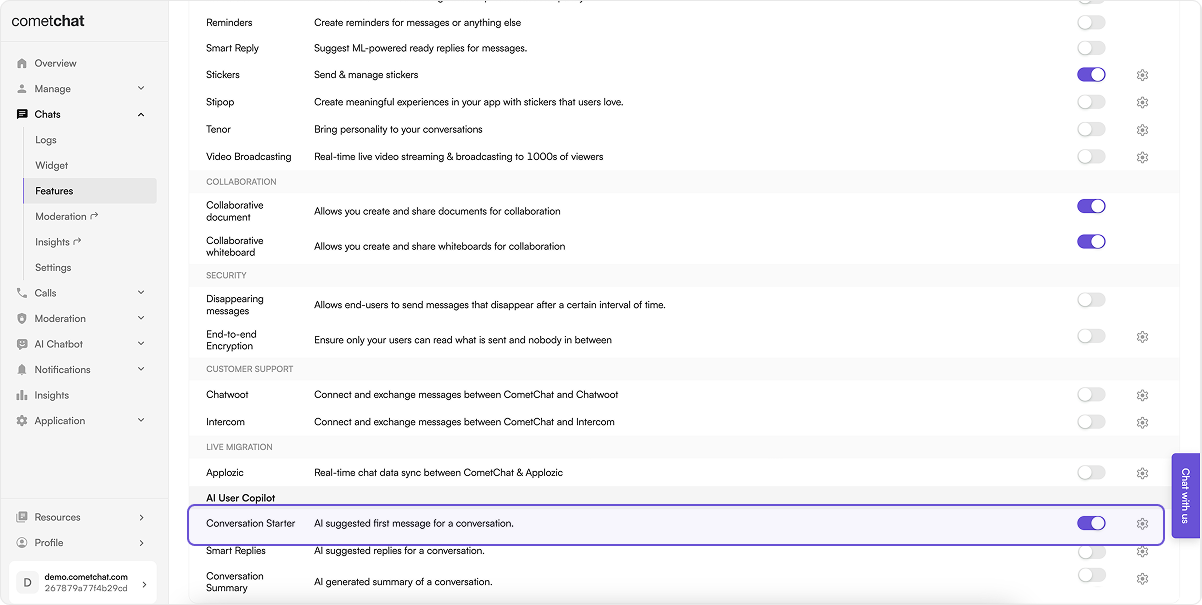 - Set up the AI settings through the CometChat dashboard as detailed in the Overview section.