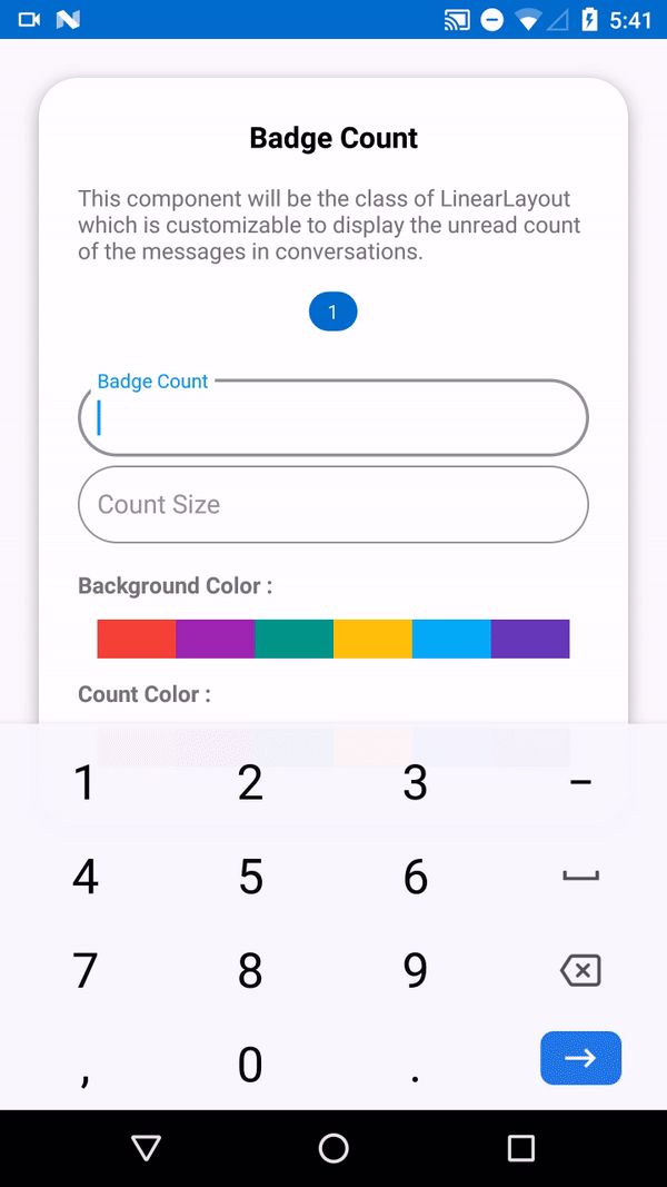 | Count Background Color | app:count_background_color``# setCountBackground(@ColorRes color) |